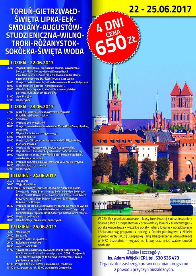 Toruń – Gietrzwałd – Święta Lipka – Ełk – Smolany – Augustów – Studzieniczna – Wilno – Troki – Różanystok – Sokółka – Święta Woda